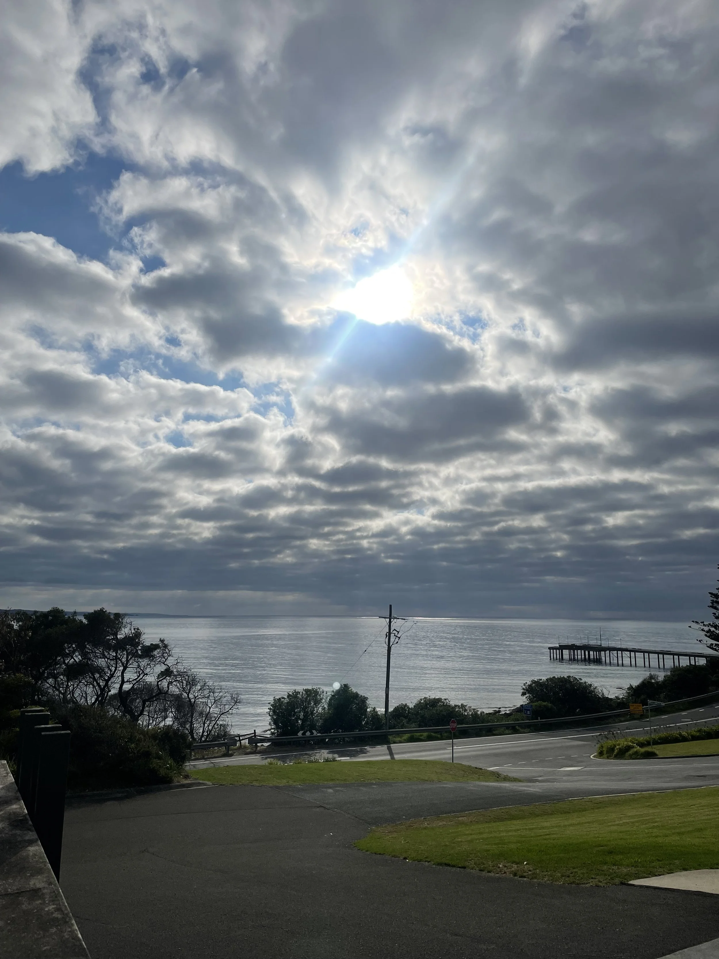 It’s a cloudy Saturday morning on the Surf Coast and what looked like a curtain of rain coming across the ocean is actually sunbeams. There is the most illuminated patch of light in the middle of the ocean from a tiny break in the clouds, it’s extraordinary. So bright and sparkly.